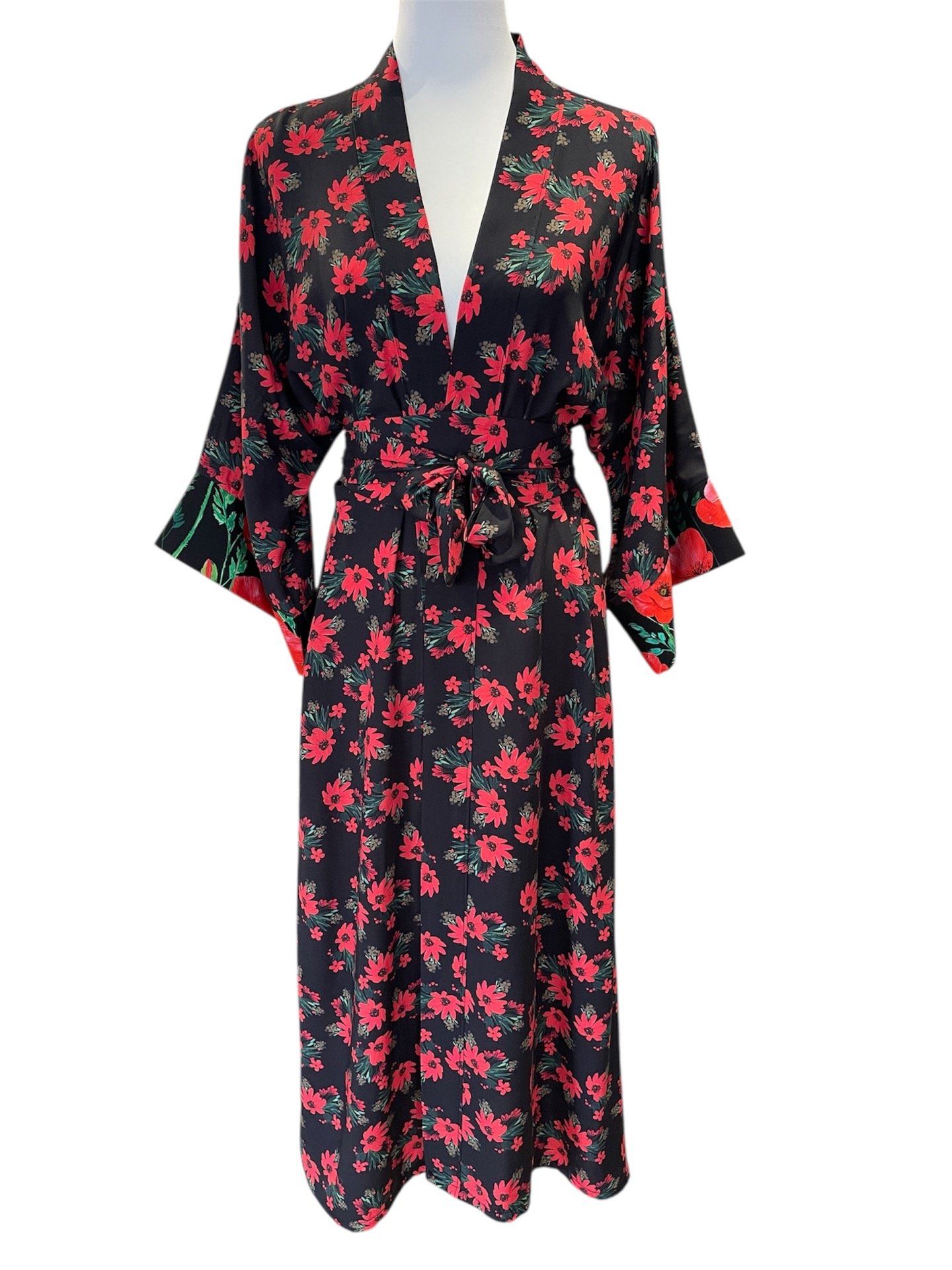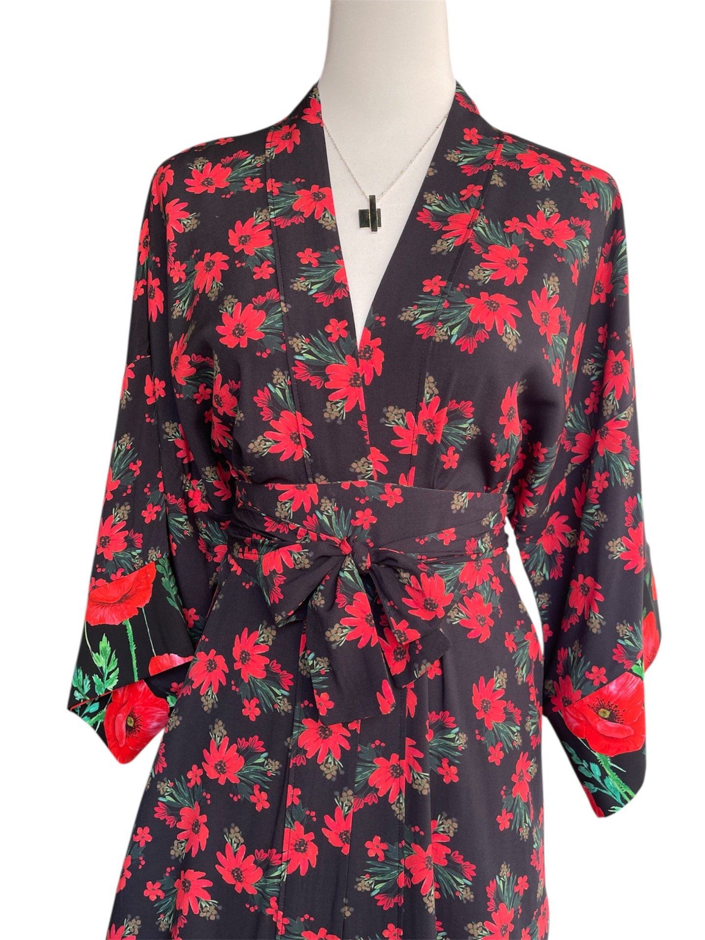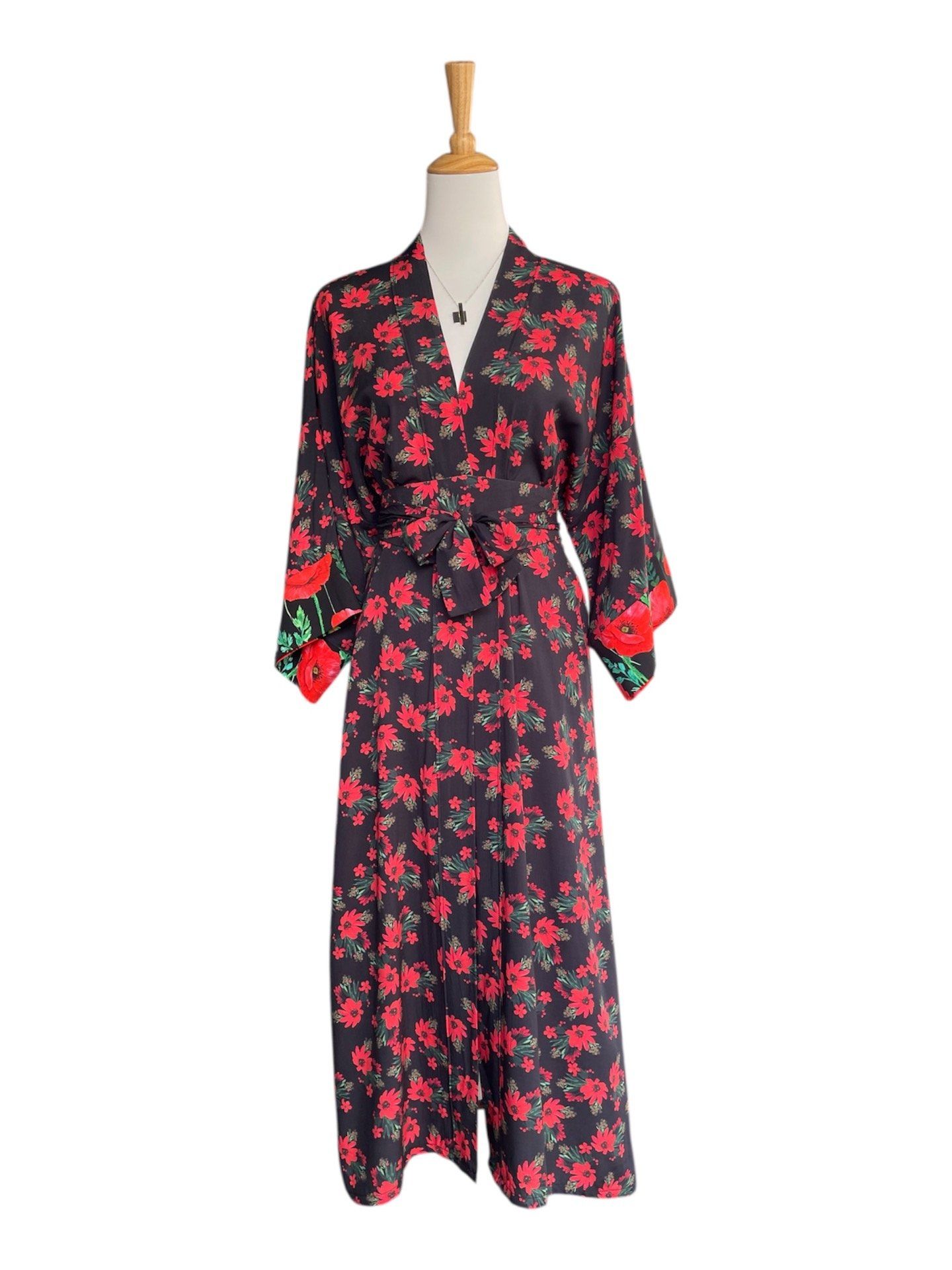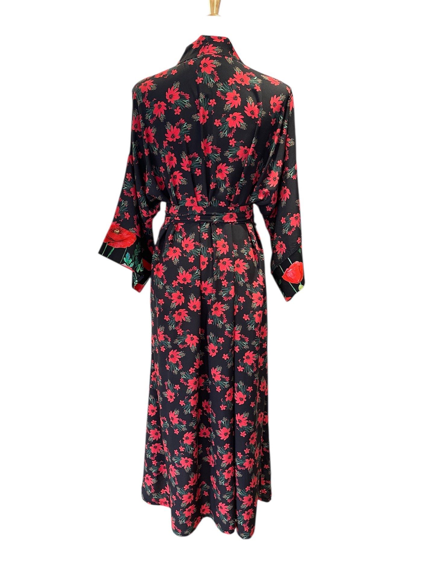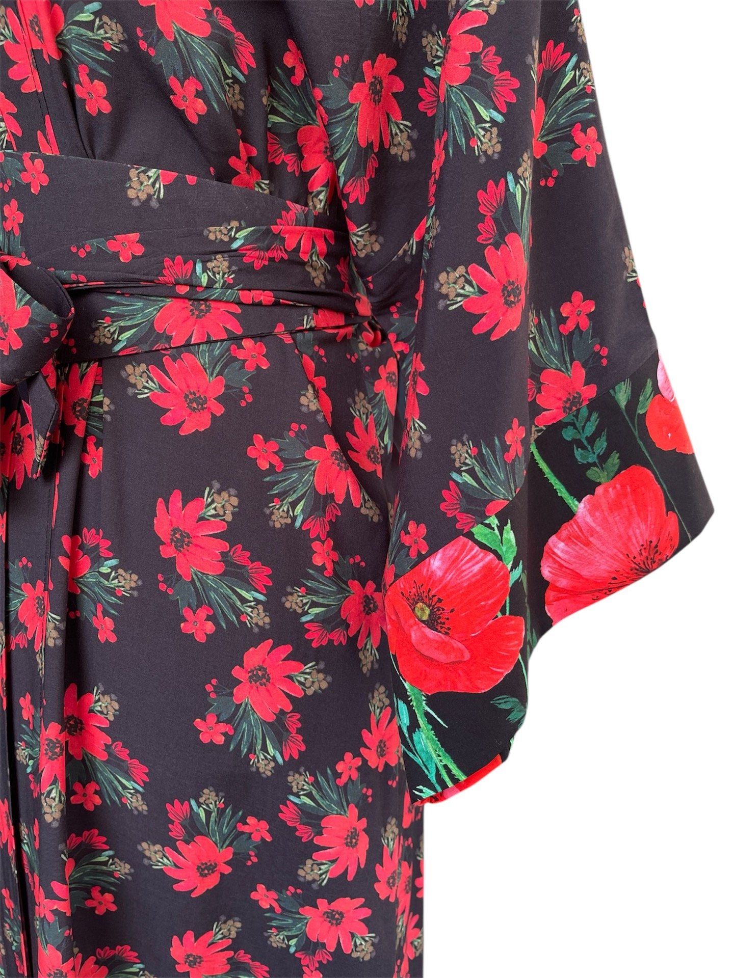 Une brise andalouse souffle sur ce kimono long, doté d'une ceinture empire, où la profondeur du noir met en lumière l'éclat ardent des coquelicots rouges.
